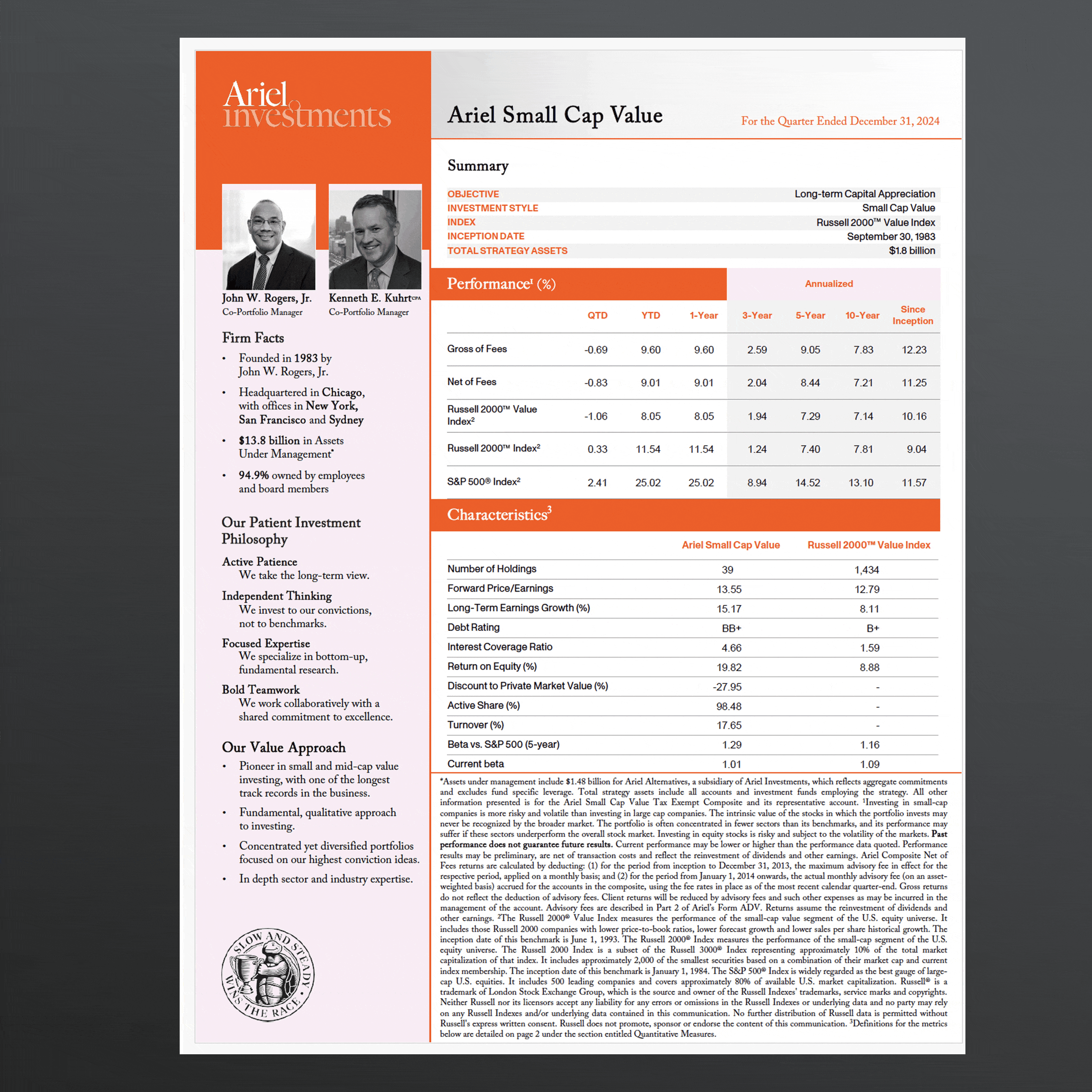 Ariel Investments is a prominent minority-owned investment management firm founded in 1983 by John W. Rogers Jr. They’re recognized for their commitment to diversity and inclusion in the financial industry, with co-CEO Mellody Hobson spearheading their efforts. With a reputation for disciplined research and a long-term perspective, Ariel Investments serves individual and institutional clients, helping them build sustainable wealth over time.