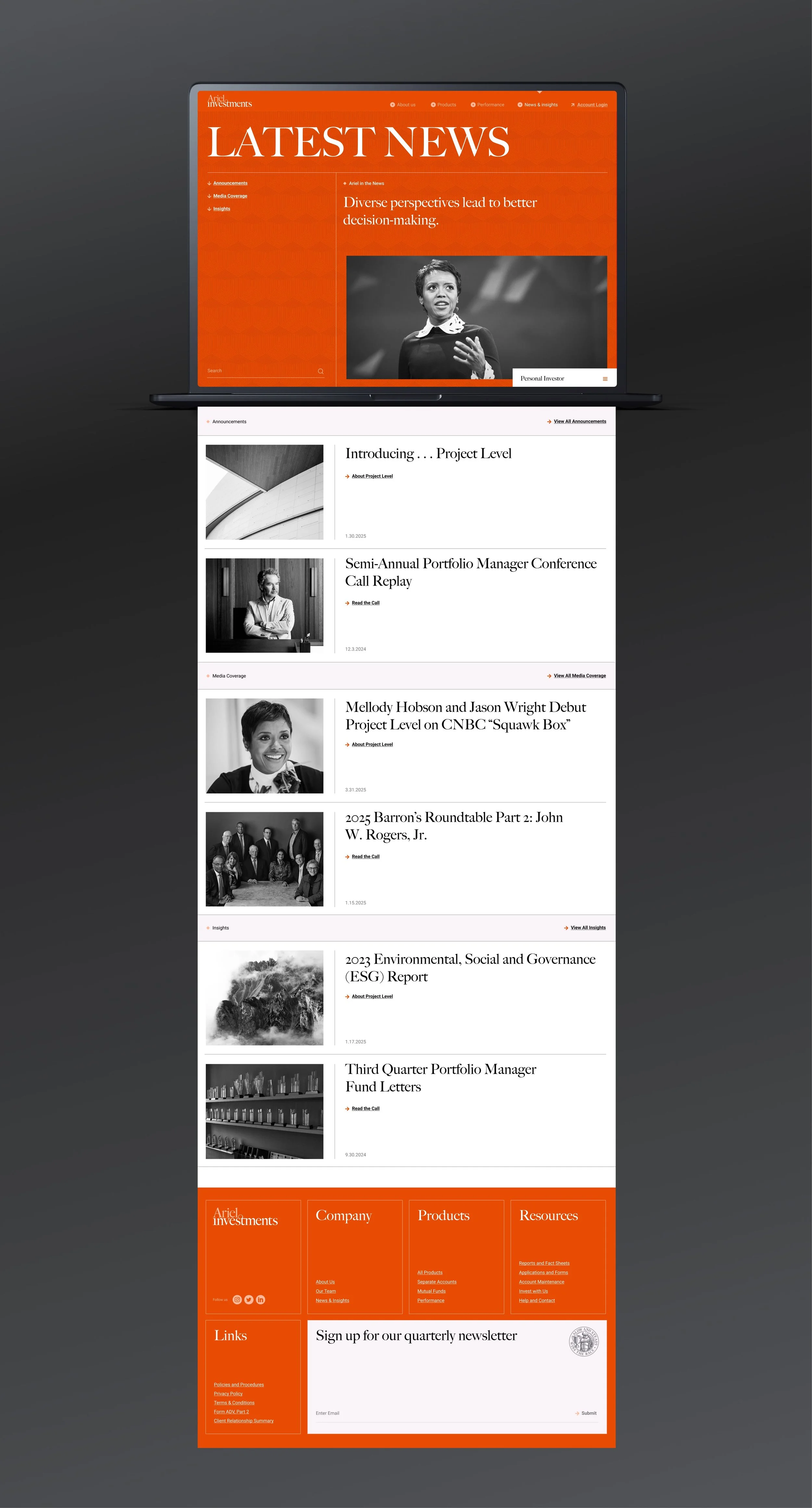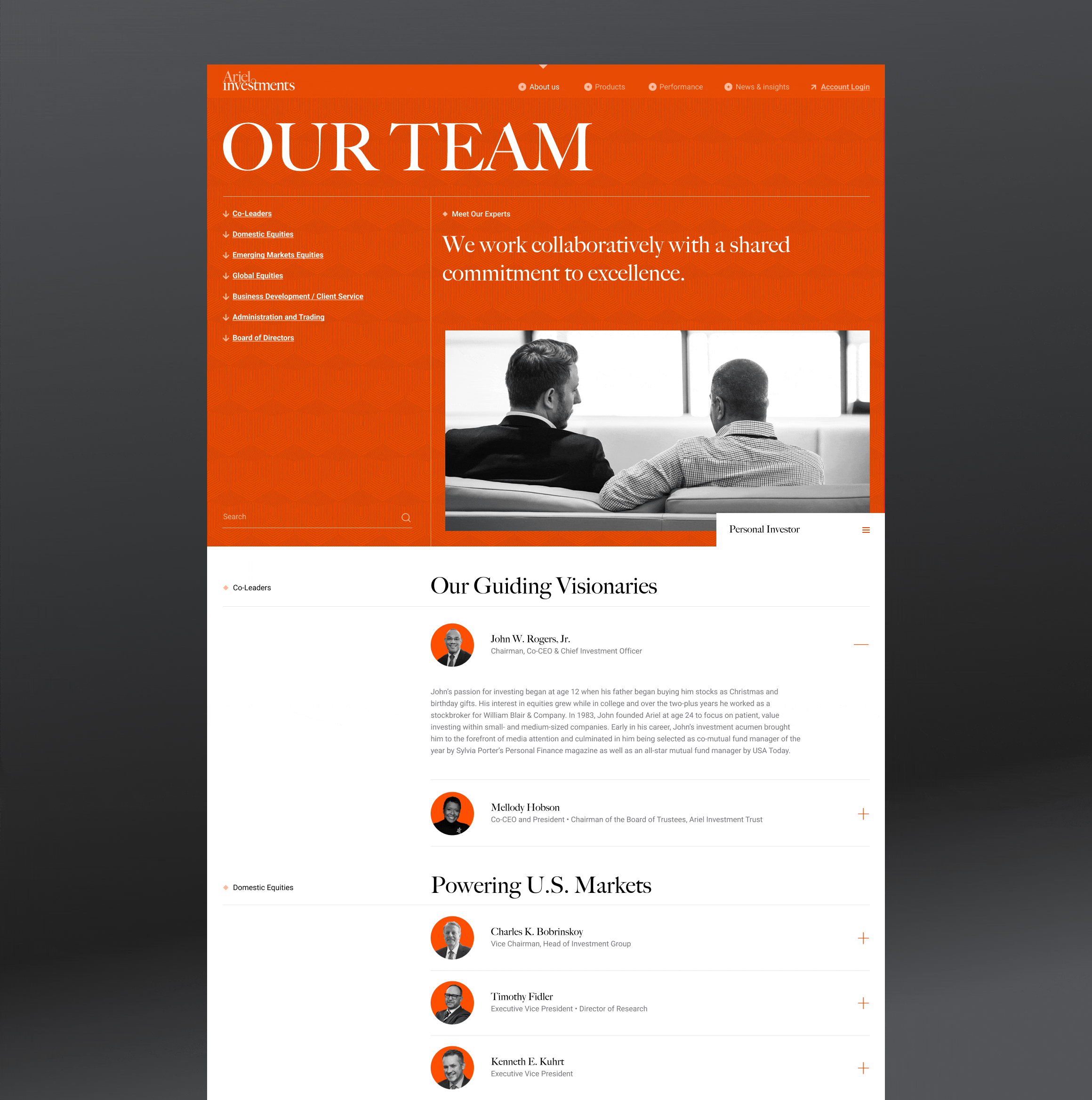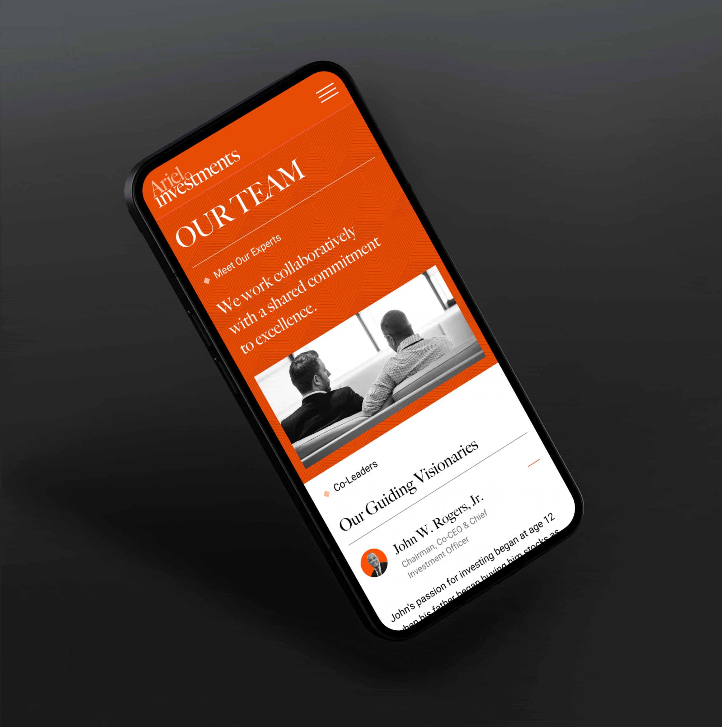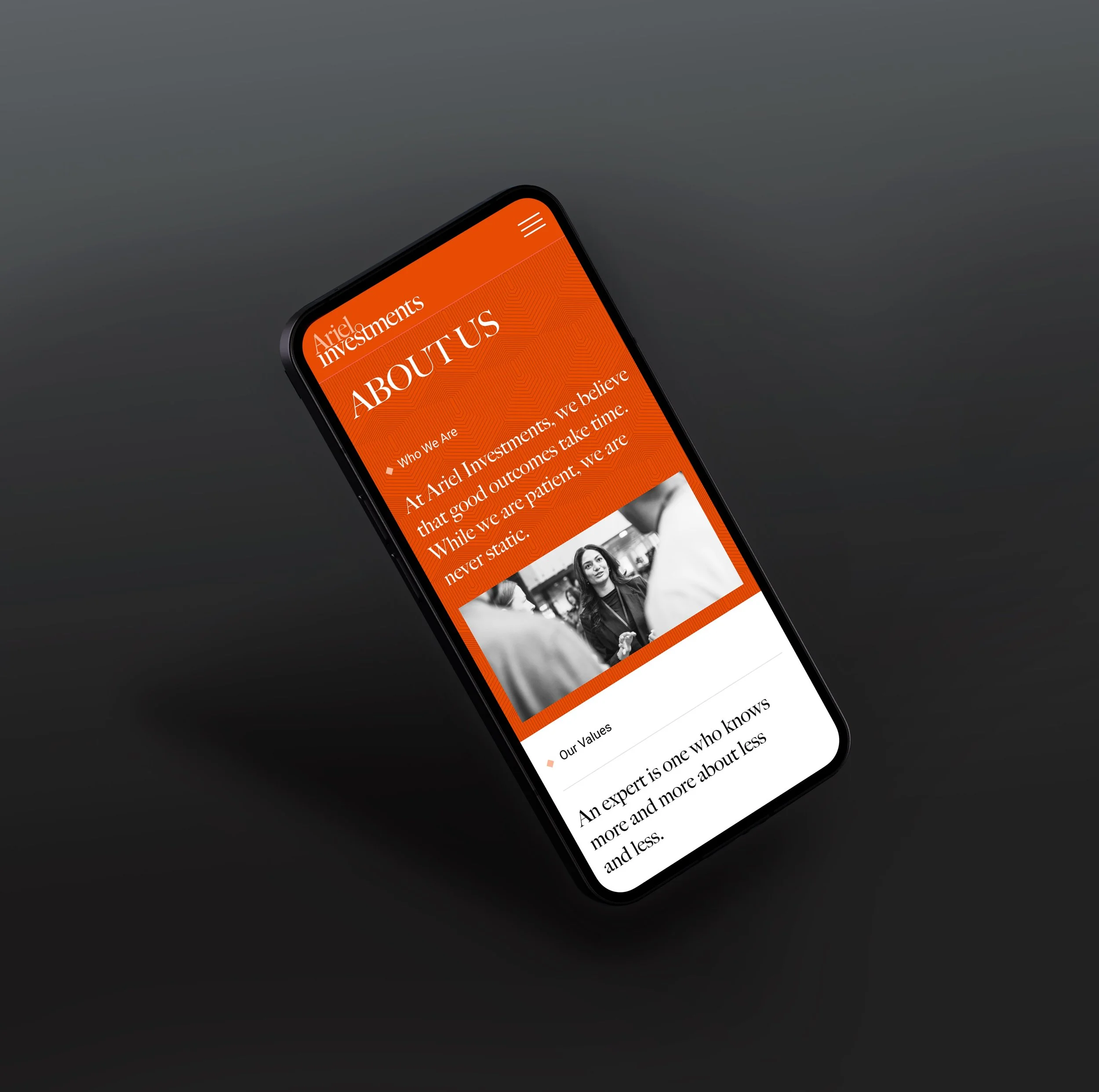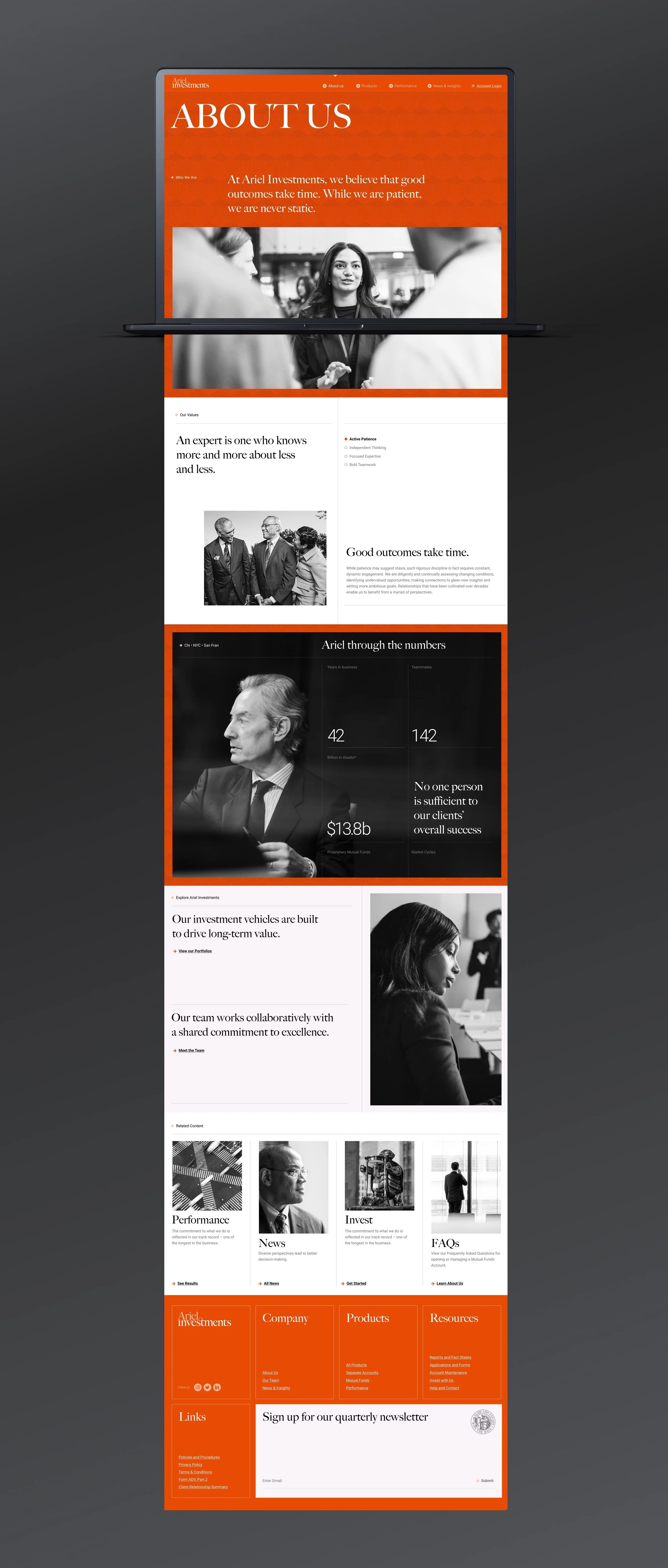 With a foundational brand template in place, I set out to craft an experience that truly embodied Ariel Investments’ vision. To achieve their goal of a "premium" presence, I leaned into the principles of editorial design—balancing sophisticated typography, elegant layouts, and a refined visual hierarchy. This approach ensured a polished, high-end aesthetic while maintaining clarity and accessibility. At the same time, I introduced dynamic elements—bold splashes of color, thoughtful animations, and interactive moments—to infuse the site with energy and modernity. The result was a digital experience that felt both elevated and engaging, seamlessly blending tradition with innovation.