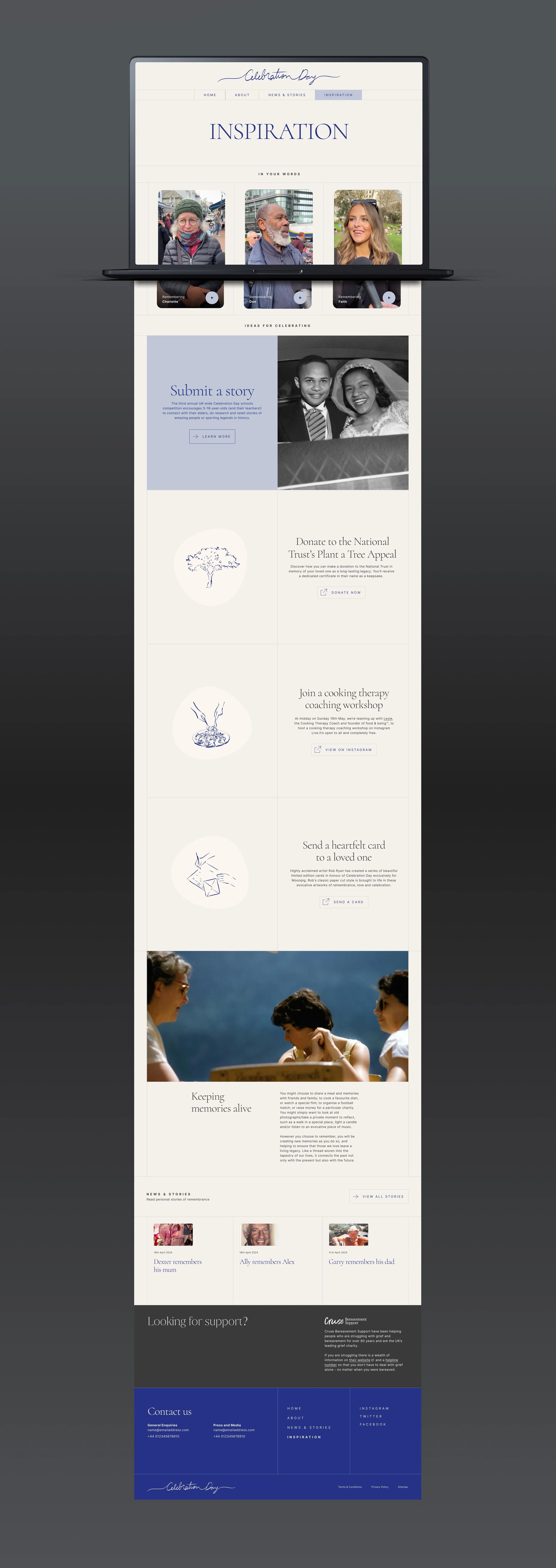 I was provided with a set of vectorized illustrations, which became the foundation of the design. Their clean, linear style inspired me to create a grid-based layout to house content. To infuse life into the design, I subtly animated the illustrations, giving them a dynamic, almost organic sense of motion. Finally, I incorporated a text highlight technique to emphasize key content, creating the feeling of a story being told—much like the cherished stories we hear about those we’ve lost.
