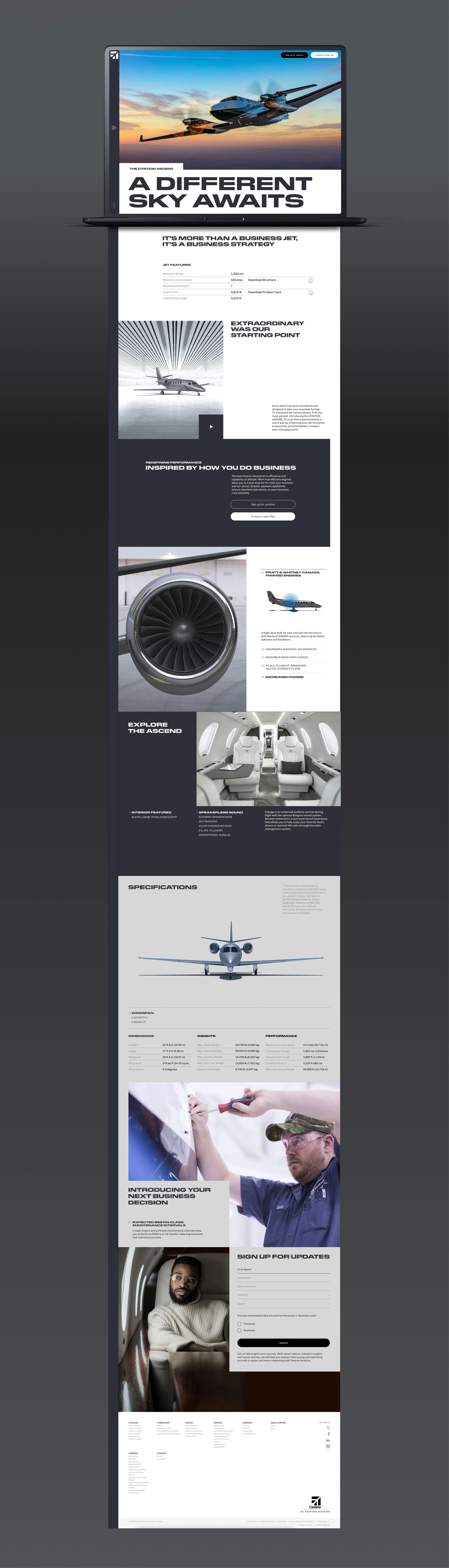Working with an extensive collection of high-end video and photography assets, along with established brand guidelines, I designed a single-page scroll that would captivate potential buyers. The design strategy employed typographic scaling, strategic negative space, and editorial-inspired layouts to create a visual narrative reflective of the aircraft's premium positioning. I focused on designing distinct layouts and animations for each section of the page, ensuring the content felt engaging and kept the user’s attention.