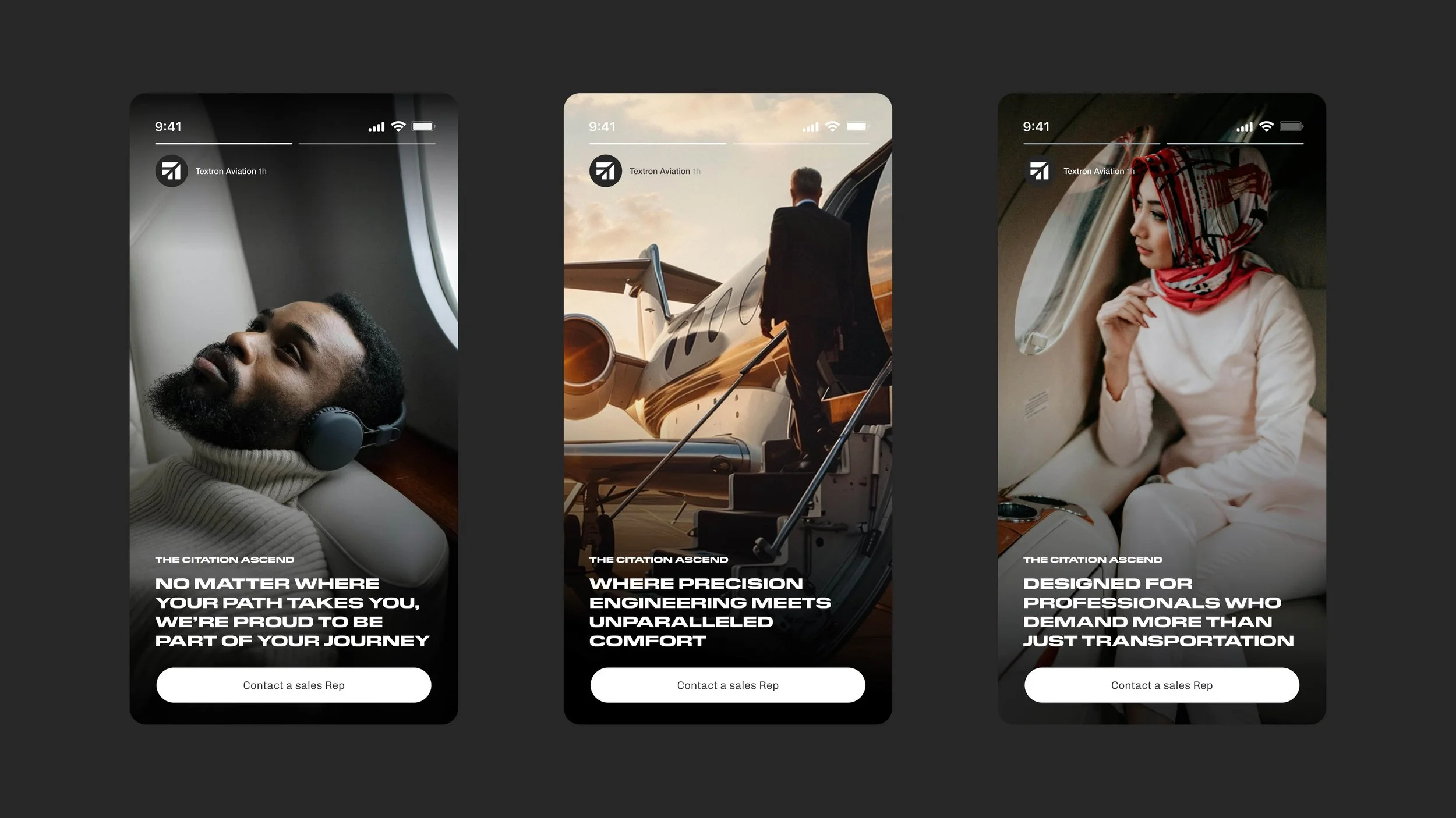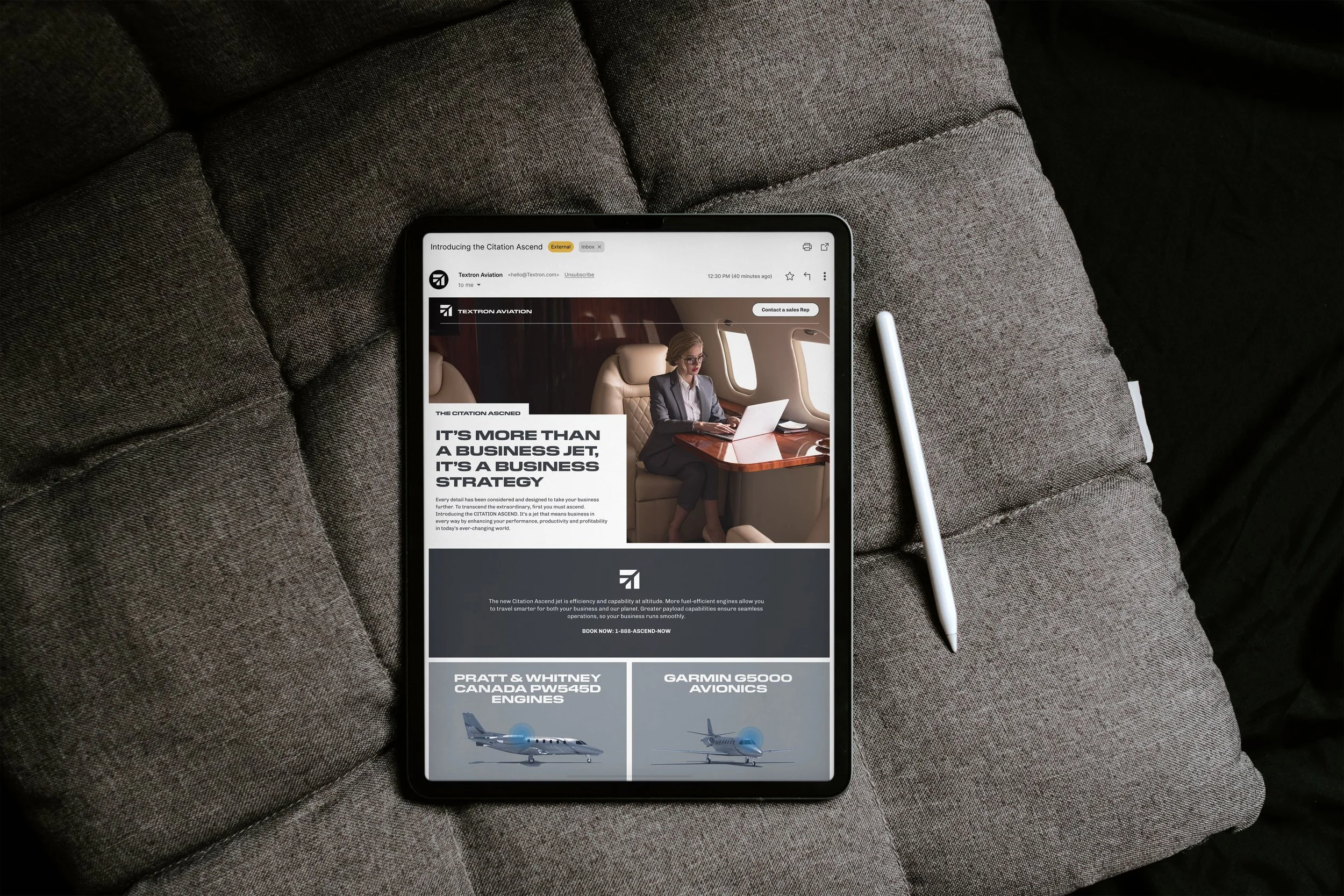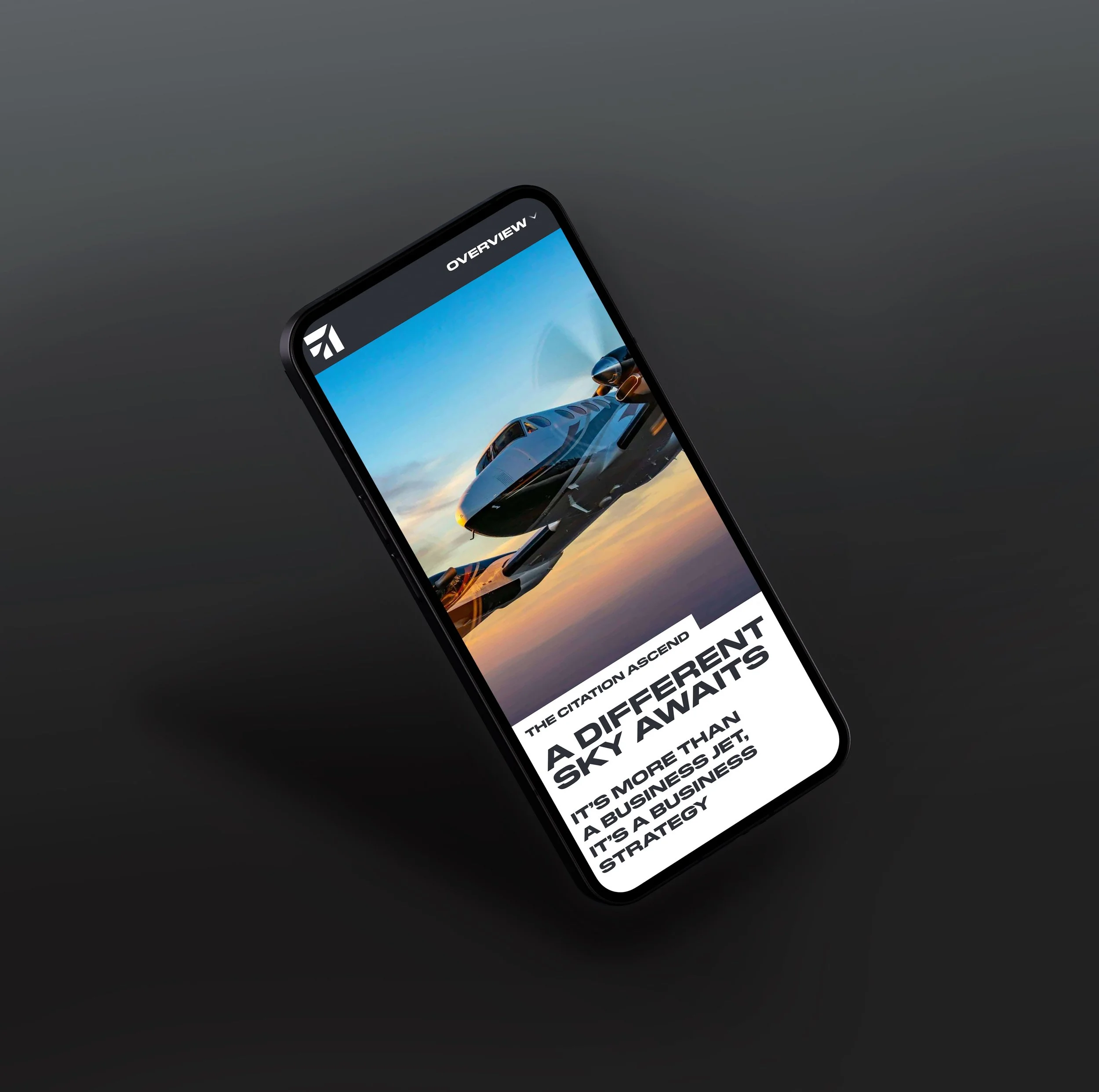For the launch of the Citation Ascend—Textron Aviation's most innovative private jet—I developed an interactive microsite that would serve as the primary announcement platform. The site was designed to showcase the aircraft's cutting-edge capabilities and extensive customization options, while integrating within Textron's existing web ecosystem. The goal was to create a digital showcase that would capture the imagination of potential buyers and highlight the unique features of this groundbreaking aircraft.